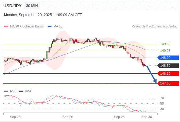在 148.90 之下,看跌,目标价位为 148.10 ,然后为 147.60 。