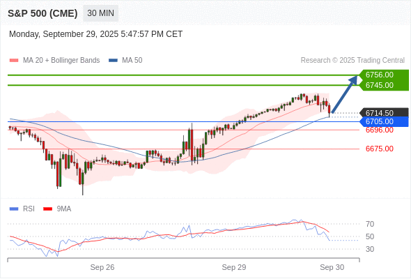 在 6705.00 之上,看涨,目标价位为 6745.00 ,然后为 6756.00 。
