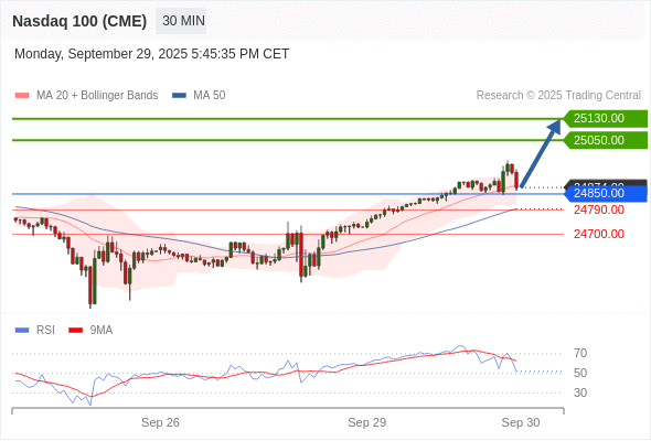 在 24850.00 之上,看涨,目标价位为 25050.00 ,然后为 25130.00 。