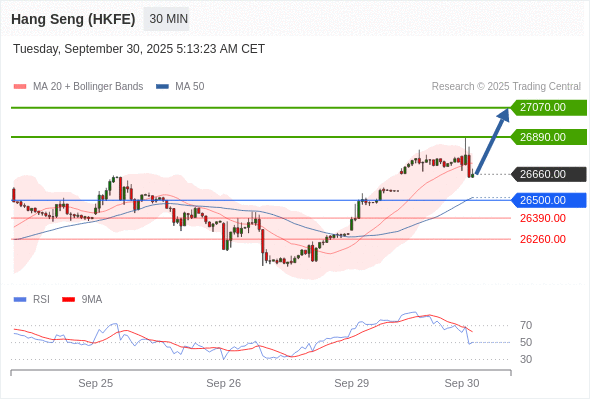 香港恒生指数期货 当日内: 在26500.00之上,看涨。