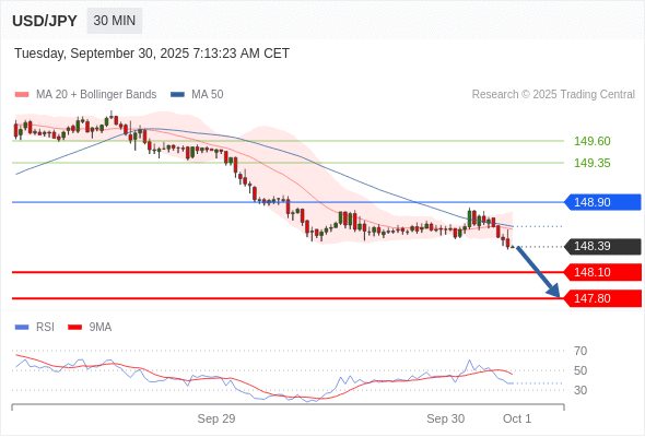 在 148.90 之下,看跌,目标价位为 148.10 ,然后为 147.80 。