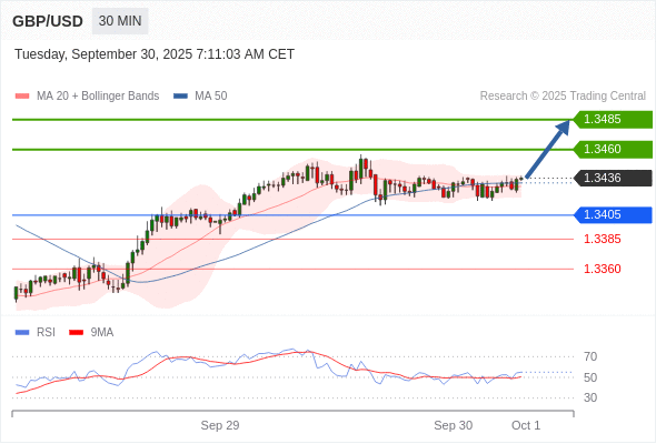 在 1.3405 之上,看涨,目标价位为 1.3460 ,然后为 1.3485 。