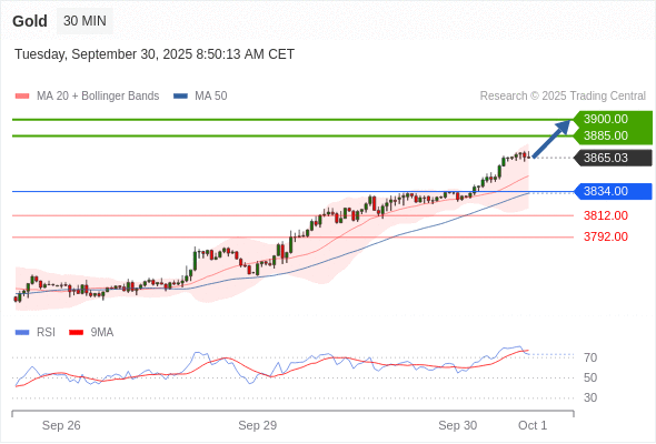 在 3834.00 之上,看涨,目标价位为 3885.00 ,然后为 3900.00 。