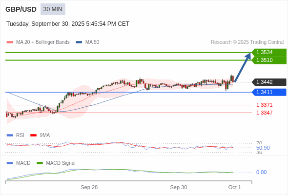 英镑/美元 当日内 : 看涨,当 1.3411 为支撑位。
