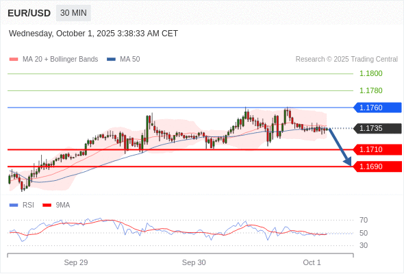 欧元/美元 当日内: 短期关键阻力位在1.1760。