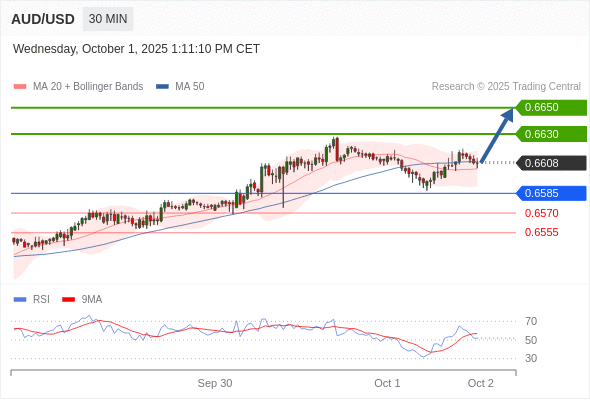 在 0.6585 之上,看涨,目标价位为 0.6630 ,然后为 0.6650 。