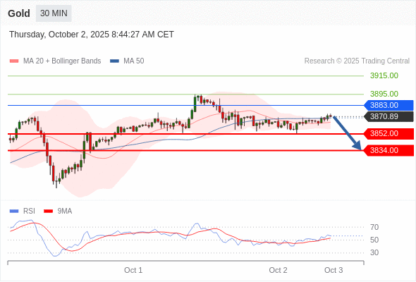 交易策略: 在 3883.00 之下,看跌,目标价位为 3852.00 ,然后为 3834.00 。