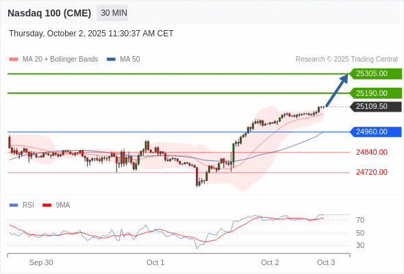 在 24960.00 之上,看涨,目标价位为 25190.00 ,然后为 25305.00 。