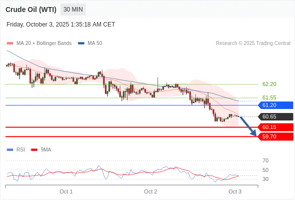 在 61.20 之下,看跌,目标价位为 60.15 ,然后为 59.70 。