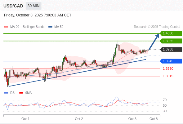 在 1.3945 之上,看涨,目标价位为 1.3985 ,然后为 1.4000 。