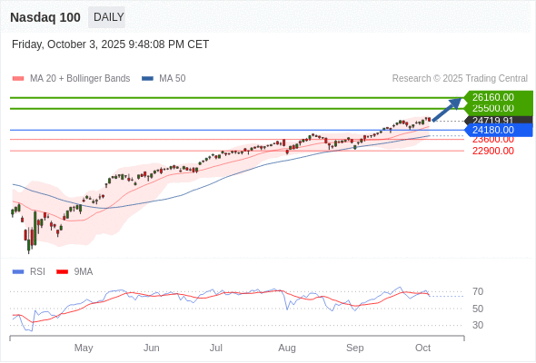 纳斯达克100 短线: 在24180.00之上,看涨。