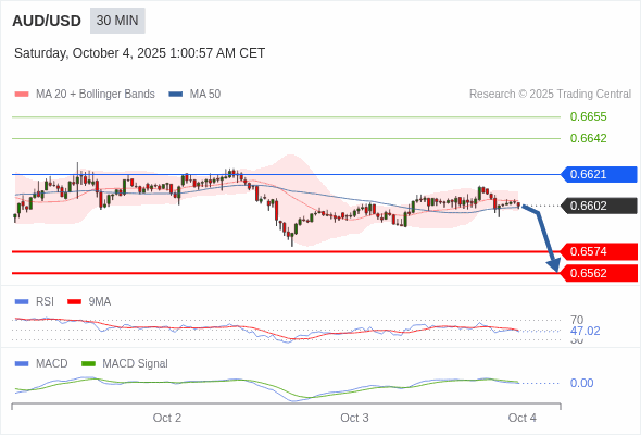 交易策略: 逐渐下跌,当 0.6621 阻碍上行,则 0.6562 为目标位。