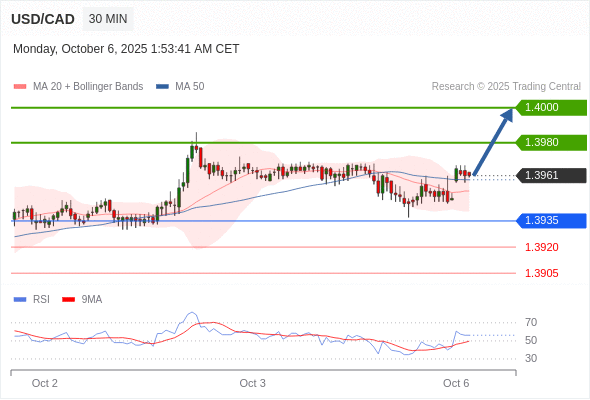 在 1.3935 之上,看涨,目标价位为 1.3980 ,然后为 1.4000 。