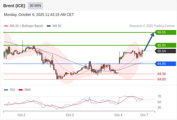 布伦特原油 (ICE) (Z5) 当日内: 在64.85之上,看涨。