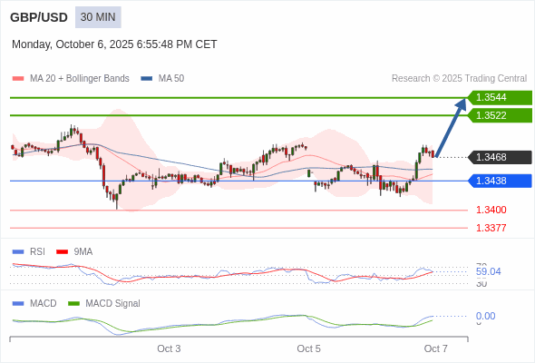 英镑/美元 当日内 : 看涨,当 1.3438 为支撑位。