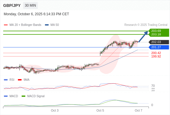 英镑/日元 当日内: 看涨,当 201.27 为支撑位,目标定在203.69。
