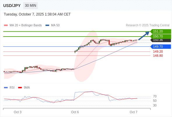 在 149.70 之上,看涨,目标价位为 150.70 ,然后为 151.20 。