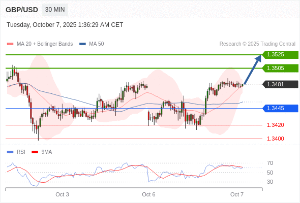 在 1.3445 之上,看涨,目标价位为 1.3505 ,然后为 1.3525 。