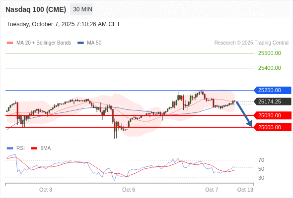 在 25250.00 之下,看跌,目标价位为 25080.00 ,然后为 25000.00 。