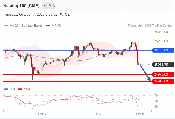 在 25180.00 之下,看跌,目标价位为 24970.00 ,然后为 24910.00 。