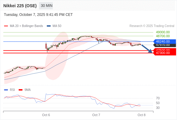 在 48240.00 之下,看跌,目标价位为 47500.00 ,然后为 47300.00 。