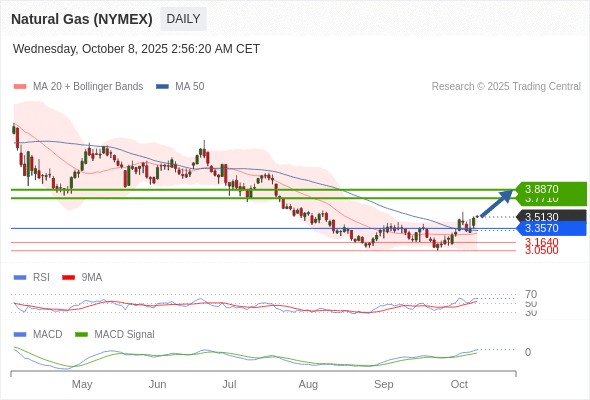 备选策略: 如跌破 3.3570 ,Natural Gas (NYMEX) (NOV5) 目标方向定在 3.1640 和 3.0500 。