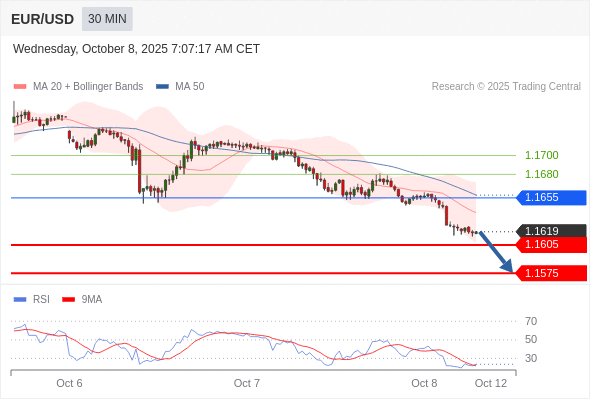 在 1.1655 之下,看跌,目标价位为 1.1605 ,然后为 1.1575 。