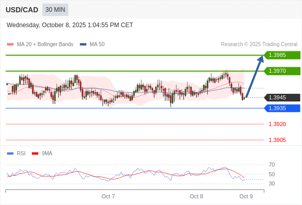 在 1.3935 之上,看涨,目标价位为 1.3970 ,然后为 1.3985 。