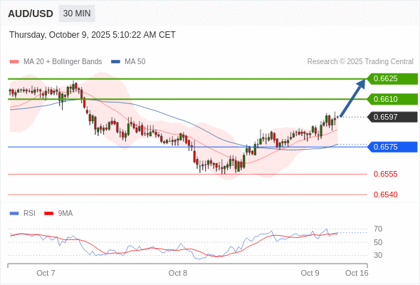 在 0.6575 之上,看涨,目标价位为 0.6610 ,然后为 0.6625 。