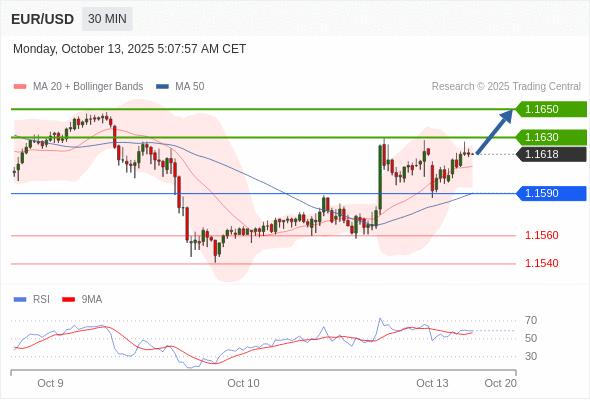 在 1.1590 之上,看涨,目标价位为 1.1630 ,然后为 1.1650 。