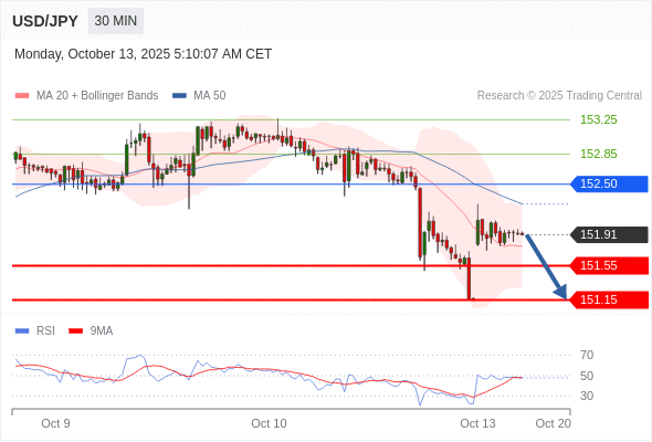 在 152.50 之下,看跌,目标价位为 151.55 ,然后为 151.15 。