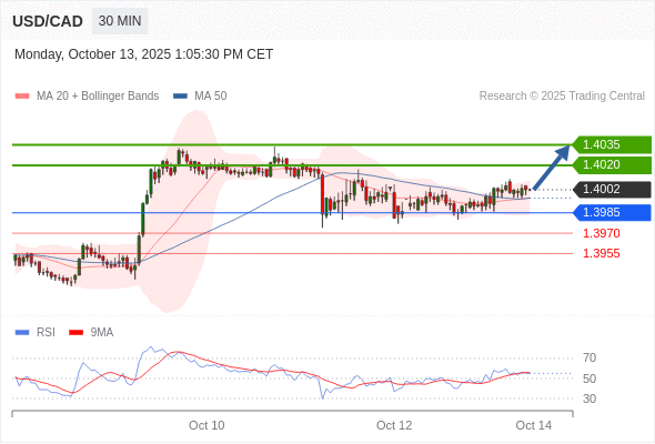 在 1.3985 之上,看涨,目标价位为 1.4020 ,然后为 1.4035 。
