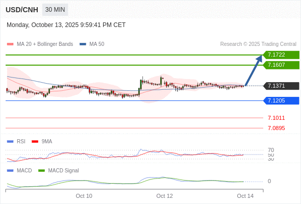 备选策略: 向下跌破 7.1205 ,将带来继续下跌的趋势,目标位为 7.1011 然后为 7.0895 。