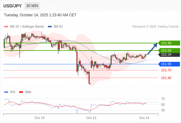 在 151.95 之上,看涨,目标价位为 152.50 ,然后为 152.80 。