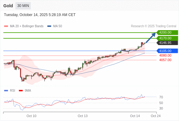 在 4105.00 之上,看涨,目标价位为 4170.00 ,然后为 4200.00 。