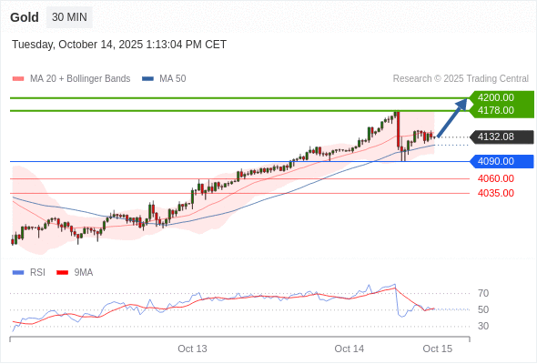 在 4090.00 之上,看涨,目标价位为 4178.00 ,然后为 4200.00 。
