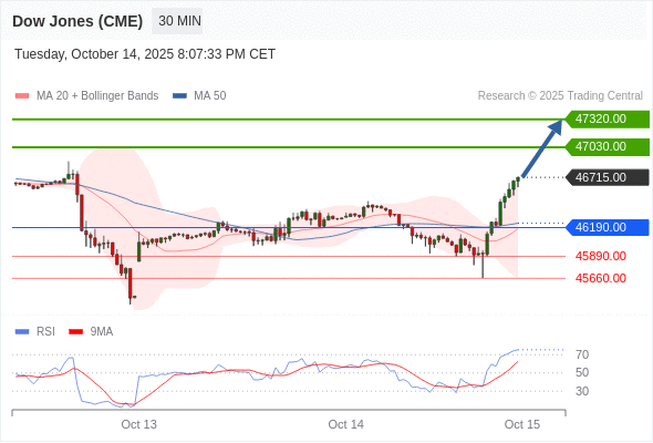 在 46190.00 之上,看涨,目标价位为 47030.00 ,然后为 47320.00 。
