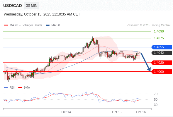 在 1.4055 之下,看跌,目标价位为 1.4020 ,然后为 1.4000 。