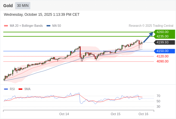 在 4150.00 之上,看涨,目标价位为 4235.00 ,然后为 4260.00 。