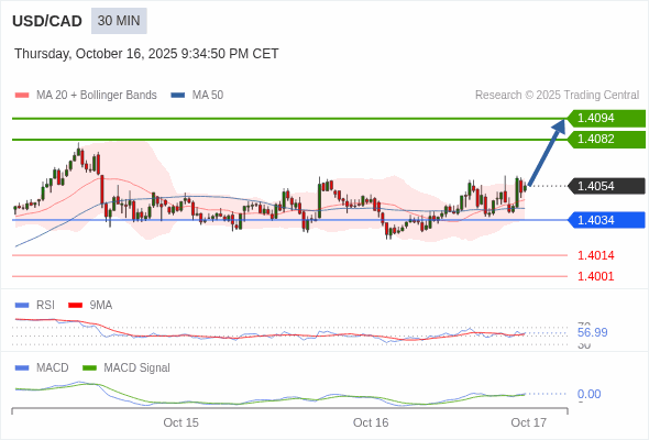 美元/加元 当日内 : 看涨,当 1.4034 为支撑位。