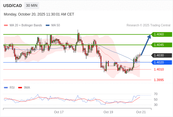 在 1.4020 之上,看涨,目标价位为 1.4045 ,然后为 1.4060 。
