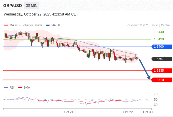在 1.3400 之下,看跌,目标价位为 1.3335 ,然后为 1.3310 。