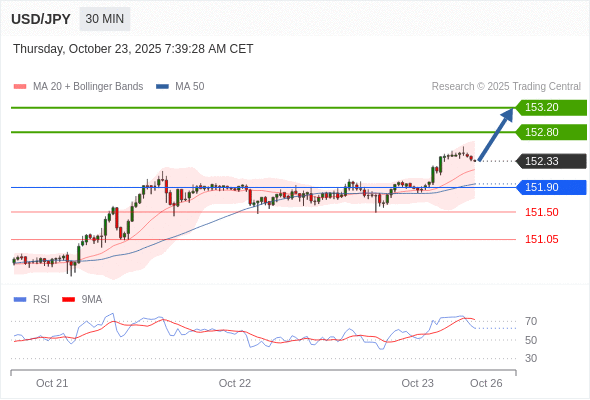在 151.90 之上,看涨,目标价位为 152.80 ,然后为 153.20 。