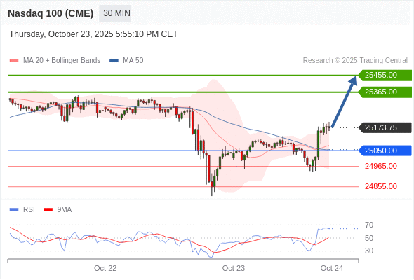 在 25050.00 之上,看涨,目标价位为 25365.00 ,然后为 25455.00 。