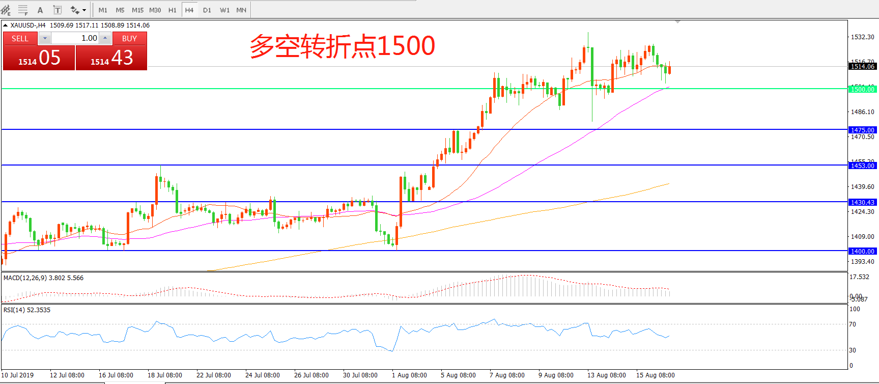 因股市和美元走强,金价暂时走弱,但投资者全球经济放缓的忧虑以及贸易前景不明朗仍然是支撑金价的重要因素,周五冲高1530未果后回落,一度跌近20美元,收报1514.06美元/盎司,金价整体维持在1500美元/盎司之上震荡。本周美联储主席鲍威尔将在周五举办的杰克逊霍尔研讨会上进行讲话,他的态度对金价后期研判依然十分重要。