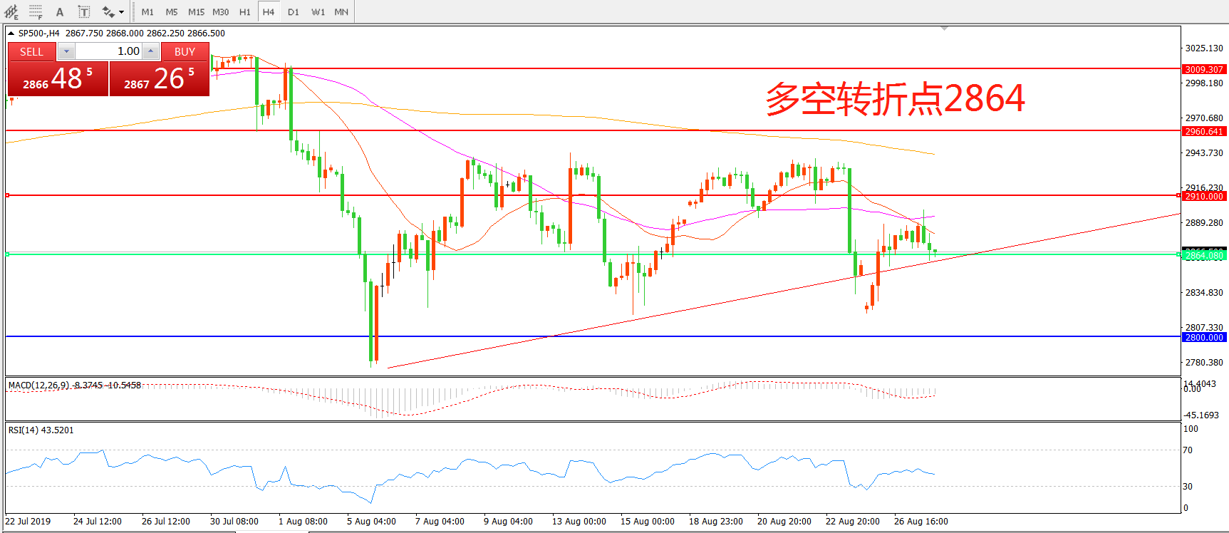 4小时图看,标普500震荡下行,再次重新回到上升趋势线支撑附近,均线系统成为上方阻力,MACD绿柱减少,RSI指标走平,日内延续窄幅震荡概率较大。