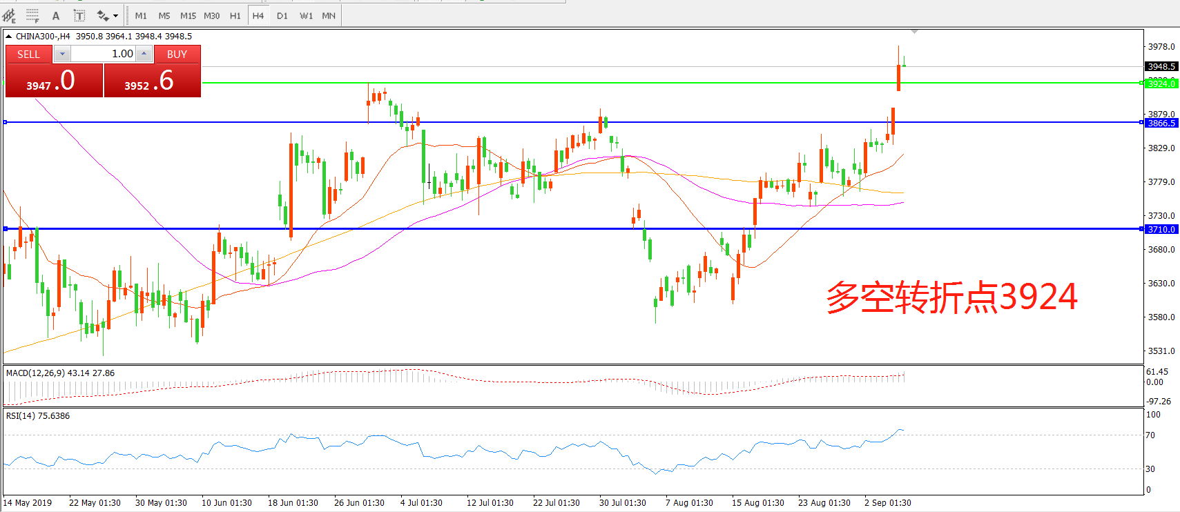 4小时图看,沪深300指数高开高走,整体表现十分强势,短期均线拐头向上,MACD红柱增加,RSI指标向上,日内延续上行概率较大。