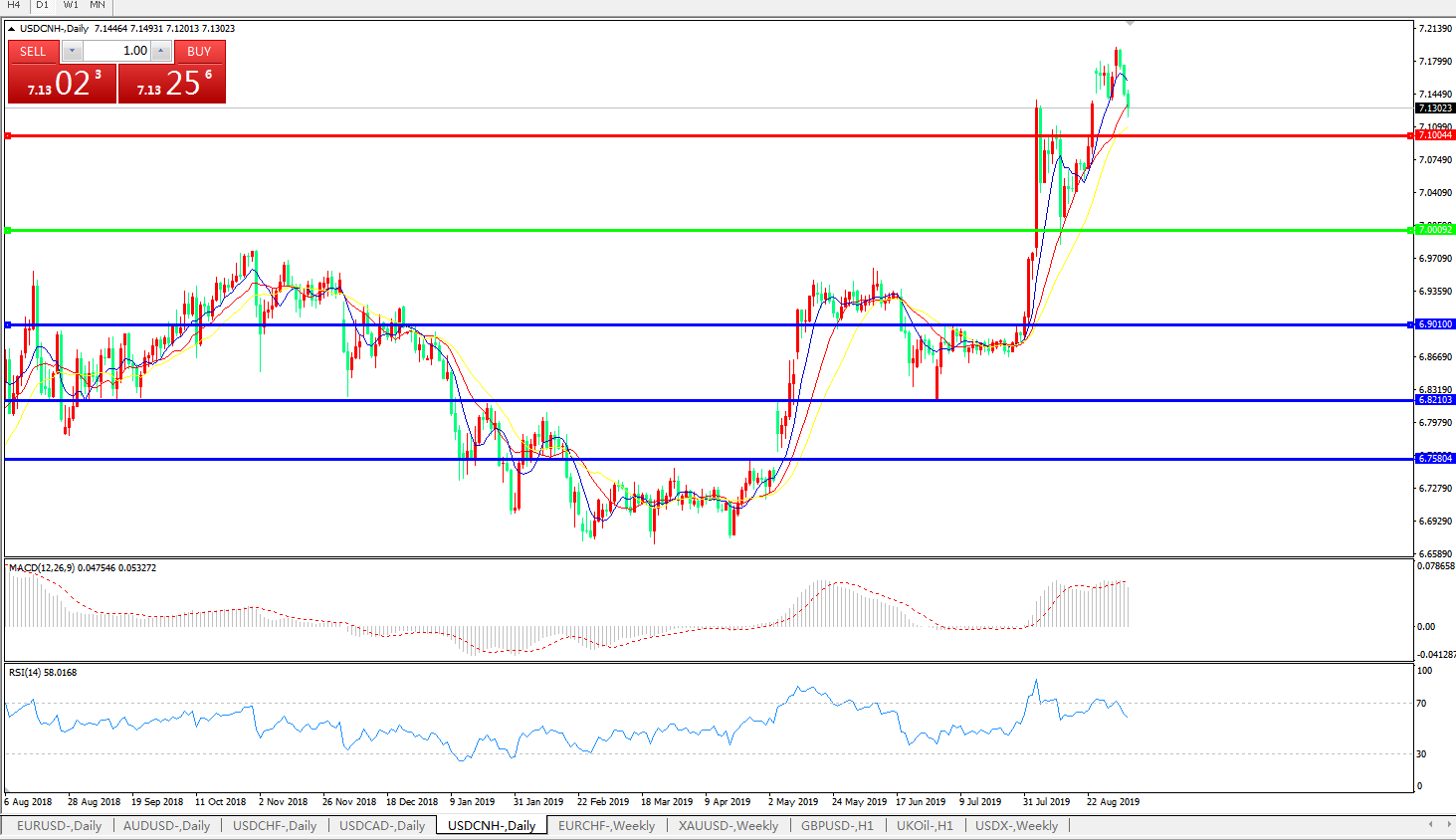 技术面简析:日图均线呈有序多头排列但短期均线开始转弱,汇价延续回落态势,MACD运行在0轴上方但动能呈缩量迹象,RSI自超买区域持续下行,预计短期汇价将继续回落下行,上方重点关注7.20-7.30区间的压制;中美贸易战后续进展决定汇价中期走势。