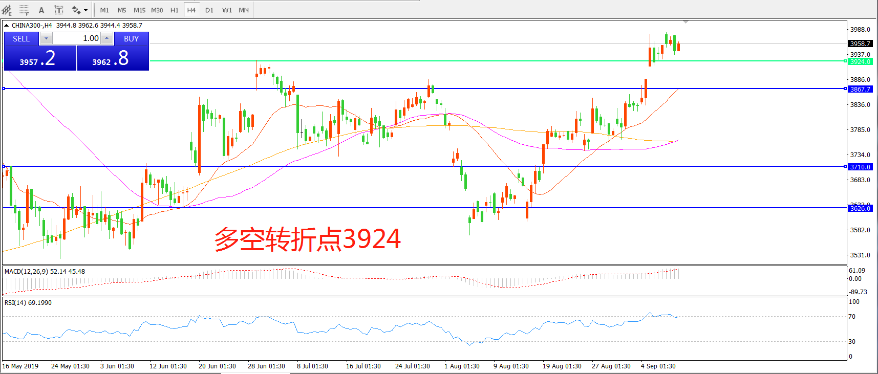 4小时图看,沪深300高开高走,短暂回踩3924支撑后,整体走势偏强,均线系统呈多头排列,MACD红柱增加,RSI指标走平,日内延续上行概率较大。