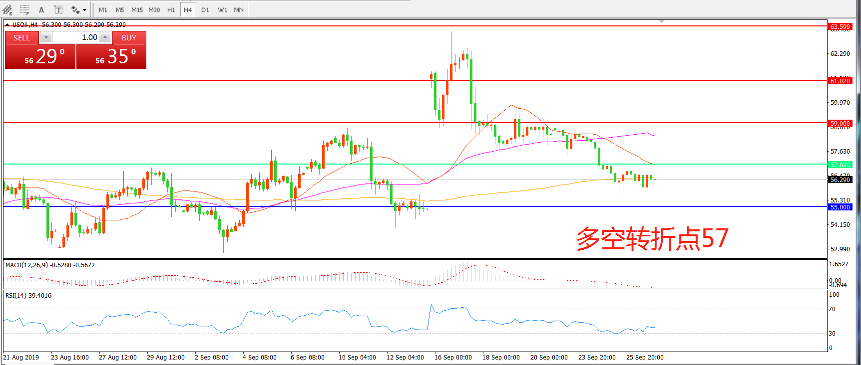 本周油价持续走弱,因在遭遇了有史以来最大规模的石油设施攻击后,沙特恢复产量的速度比自我设定的最后期限提前了大约一周,不过市场对沙特的产量恢复持怀疑态度,因此油市走向仍存疑。周四(9月26日) 美国WTI原油昨日震荡收跌0.1%,报56.31美元/桶。